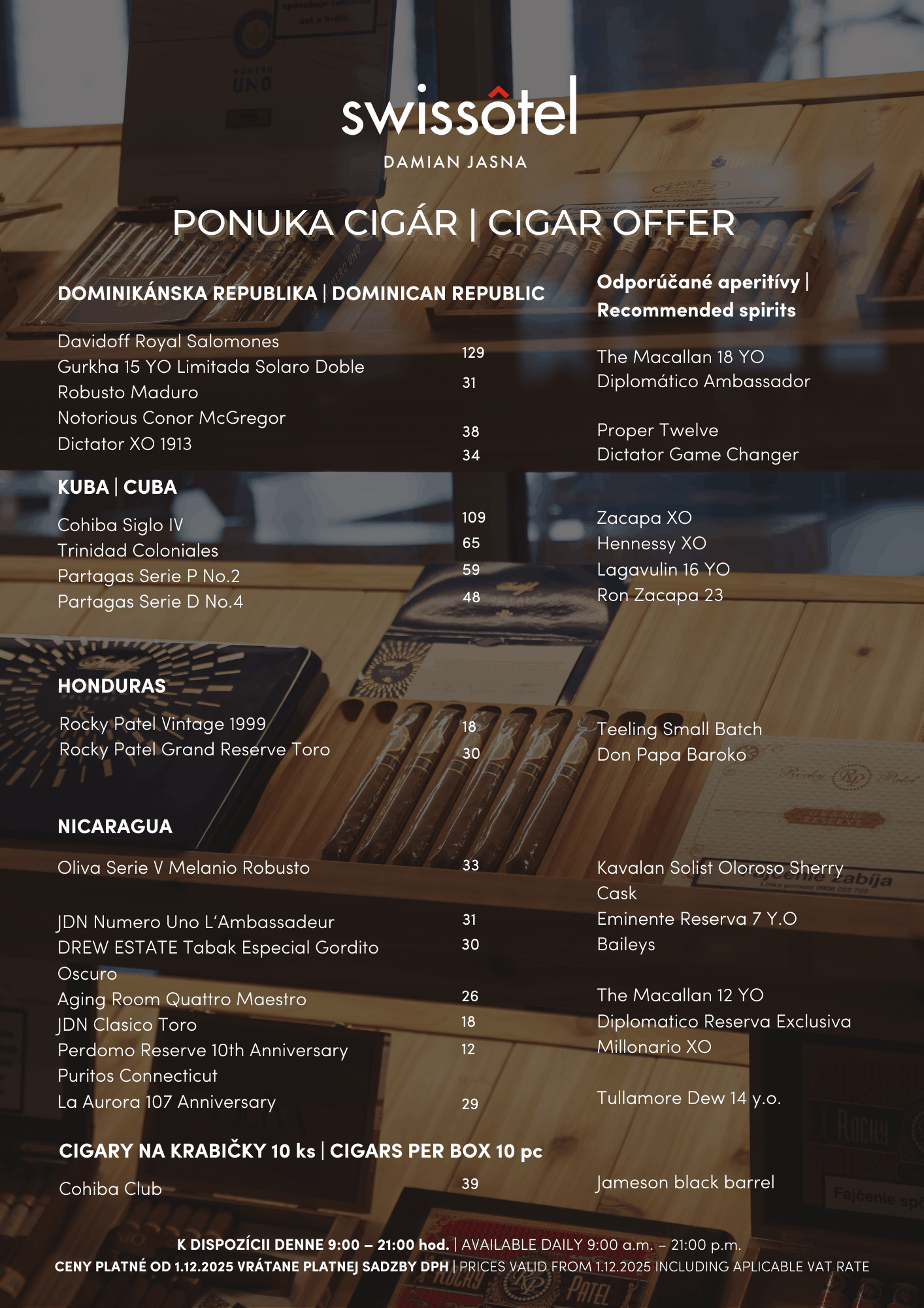 Otvorené denne od 09:00 do 21:00. Nezabudnuteľné miesto pre milovníkov cigár, kde si môžete vychutnať široký výber prémiových cigár. Naši odborníci vám radi pomôžu vybrať správnu cigaru podľa vašich preferencií. Okrem cigár ponúkame aj výber vynikajúcich koňakov a whisky, ktoré dokonale doplnia váš zážitok. Náš cigar lounge bude vybavený pohodlným nábytkom a útulnou atmosférou, kde si môžete oddýchnuť a užiť si svoj čas.